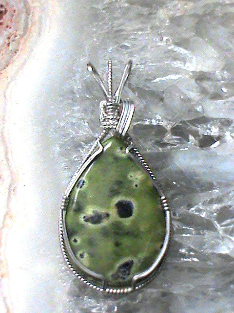 Great shades of green with purple sticktite. The stone measures 27x20mm and is wrapped in pure silver wire. Unusual stone from Tasmania. Great find!!