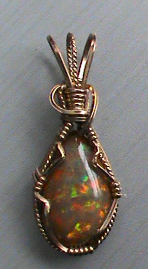 Great flash in this opal. Picture never shows how good the shine is. Wrapped in 14k gold wire this stone measures 15x10mm. Very nice opal