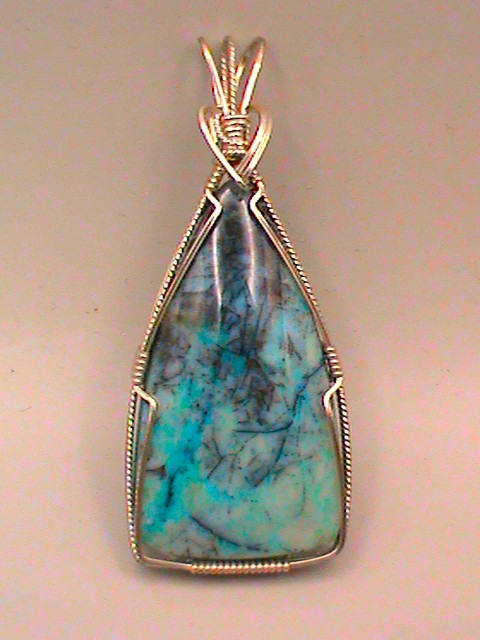 Amazing shades of blue opal from petrified wood. Wrapped in silver, this stone measures 40x23mm.