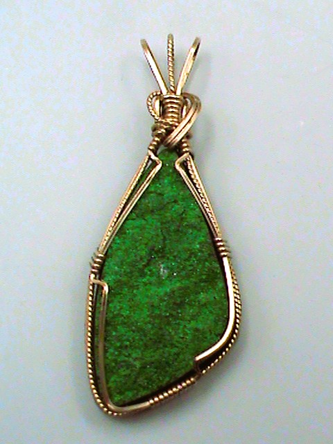Rare green garnet druzy covers this stone that is wrapped in 14k gold. The stone is from Siberia, Russia and measures 32x18mm